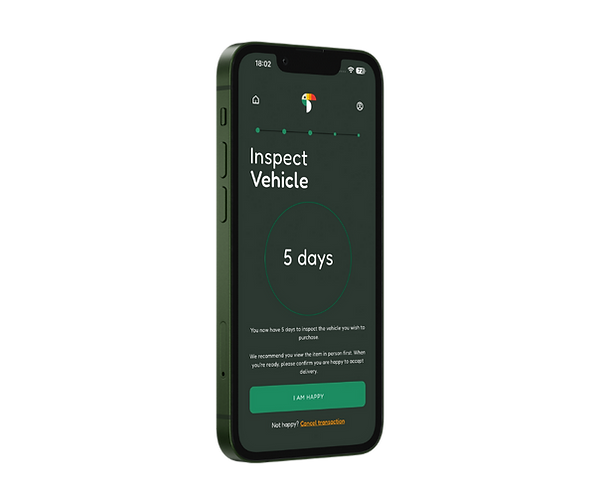 The buyer gets up to 5 days (minimum three busness days) to meet with and inspect or test the item, while funds remain securely held. Once the buyer's satisfied, they confirm in-app and sign the digital purchase agreement, locking in the funds.